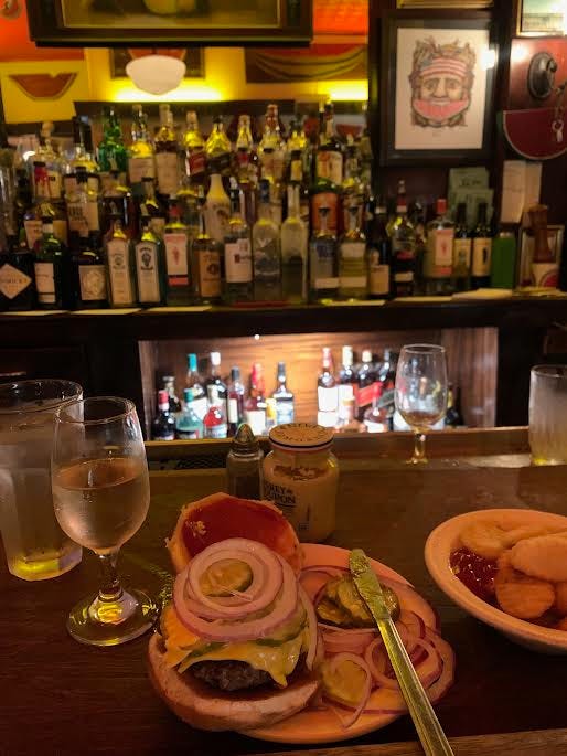 I grab my seat at the bar, and surprise myself with a hint of self-consciousness. Navigating where to put my knees and where to hold my kindle so that the light doesn’t bother those next to me. I notice my large, unruly head of hair and face of no makeup juxtaposed to a handful of corporate girlies with their neat blowouts and studied application of highlighter. Quickly the self-consciousness slips away and the joy of solo dining spreads over me. A woman my age sits beside me. Also, alone. Also, with unruly hair. We order the exact same thing, as do most at JG’s, with the exception of my wine and her water. She eats only the meat between the buns, but does get the fries, whereas I keep the burger in its integrity. We pass condiments back and forth. Are clearly finding comfort in our brief companionship but show no interest in talking to each other. A relief. She goes to the bathroom; I watch her bag and vice versa.